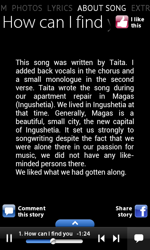A true music album is now 3 equal elements together: Music + Graphics + Story = 3plet, a revolutionary app, the new music industry format. Add here Song Lyrics, Music Videos and integration with Facebook and you get a wholistic digital piece of art, delivered to you straight from the artist! The New Era of music albums is here!