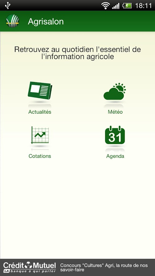 To ensure the reliability and timeliness of information published on the site and in its applications, Crédit Mutuel is surrounded by expert partners in the agricultural market. News, weather and listings are provided by and Terre-net Media, a leading group of professional agricultural press.