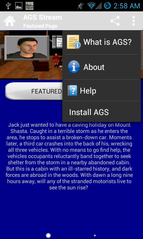 BEFORE YOU RATE OR LEAVE A REVIEW: If the app does not perform for you the way it should, Please, please please: contact me so that we can work on a fix. Please, be considerate before rating. Also, when Rating, rate the app properly. Use it within 15 minutes of purchase. It's ONLY $1.15 & you really should play with it right away to see if its an app you like or not rather than leaving me a bad review or rating so you can get a refund. If you do rate the app, rate it on what its purpose is for: It is a tool to help download & install Adventure Games made with AGS onto your Android Device. Then I would really appreciate it if you rate the app on: If it works, if it provides you with everything you need, If using it is easy for you, If it is updated frequently enough for you, if its performance is good or not, etc.. If a game will NOT FUNCTION, It might be due to a development issue with the game developer himself, or AGS, NOT AGS Stream.