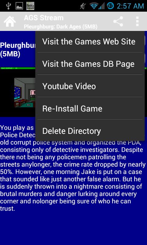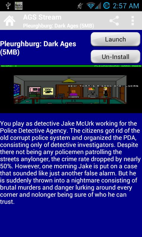 AGS Stream is a UNIQUE market app allowing you to download point and click adventure games not found anywhere else on The Play Store or any Android Market App right onto your Android Device without the hassle of manually going into your devices storage and system files to do so. This will allow you to eventually play many games not available to you before. AGS Stream simply downloads the game and the software to play it, then installs it for you and allows you to just click on the game in AGS to play it. No non-sense. No Root. Just enable installing unknown sources within your phones settings & thats it.