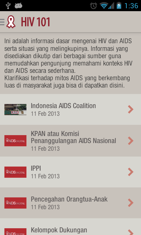 Most of us have lack information about AIDS and HIV. AIDS DIGITAL offers people living with HIV or healthy people to care and learn more about the disease with HIV 101 feature. The feature also provides knowledge and understandment about myths related to about AIDS and HIV respectively. So there will be no more miss understanding about the disease and we will able to live side by side without having fear of infected the virus.
