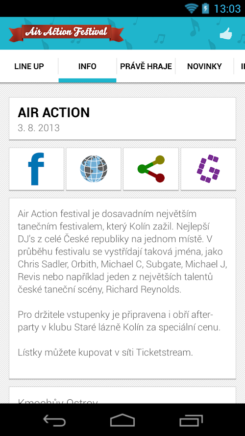 Air Action festival is so far the largest dance festival that Cologne had. The best DJ's from all over the Czech Republic in one place. During the festival, will replace such names as Chris Sadler, Orbith, Michael C, Subgate, Michael J, Revis or example, one of the most talented Czech dance scene, Richard Reynolds.