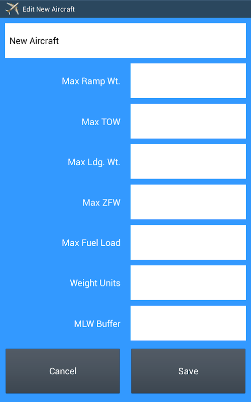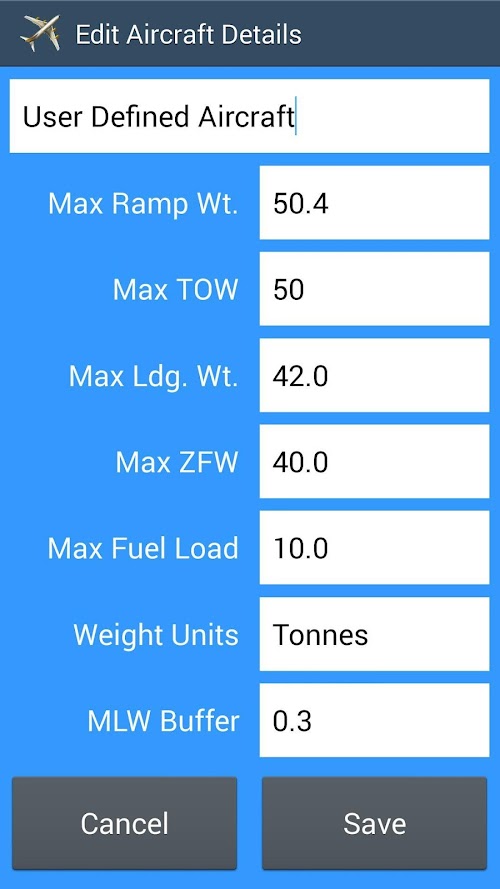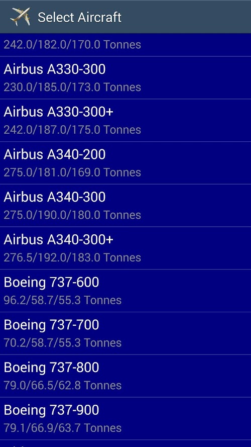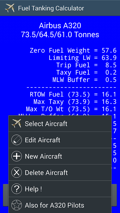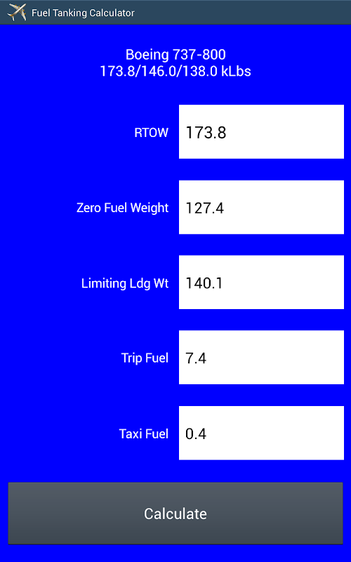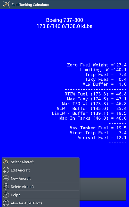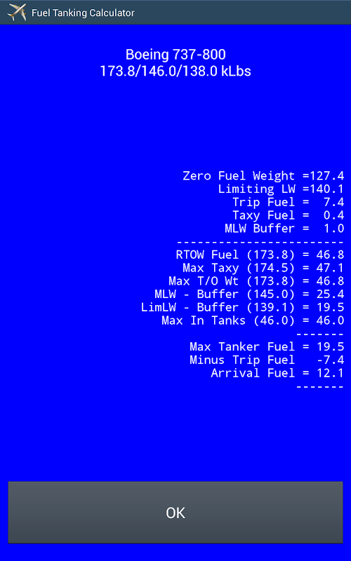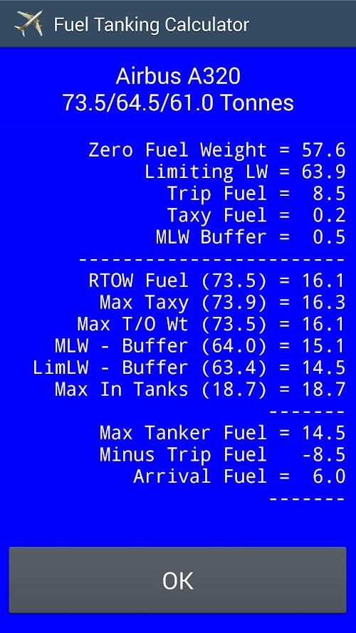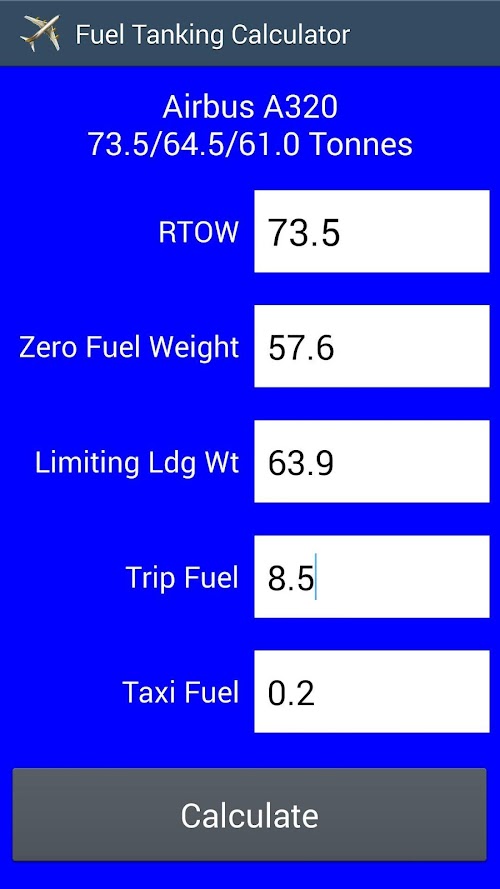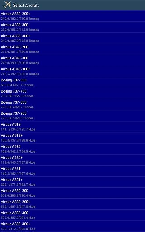 The app comes with a database of popular airliner weights or the user may define their own aircraft type.  The input data is presented together with the results to allow the user to trap 'rubbish in/rubbish out'.  The maximum fuel capability for each limitation is presented together with arrival fuel to facilitate either tanking or 'round-trip' fuel.