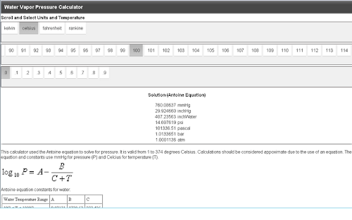 Solve for water vapor pressure given temperature using the Antoine equation. This calculation should be considered approximate due to the use of a fitted equation. The equation is valid from 1 to 374 Celsius. The calculator takes temperature inputs in kelvin, Celsius, Fahrenheit and Rankine. The output pressure is in millimeter and inch mercury, inches of water, pounds per square inch, Pascal, bar and atmospheres.