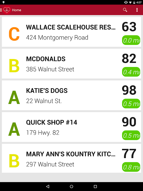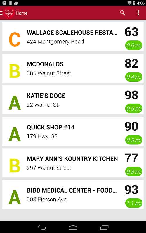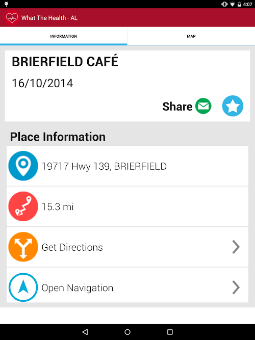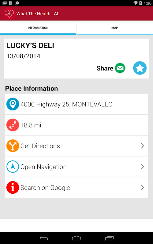 What The Health lets you easily view Health Inspection Scores for Restaurants, Hospitals, and Bar Establishments in the State of Alabama. This multi-functional app allows you to quickly view Alabama Health Scores for every Restaurant near you. Not only can you view Health Inspection Scores for restaurants in Alabama, you can get directions and share scores with friends on Facebook!