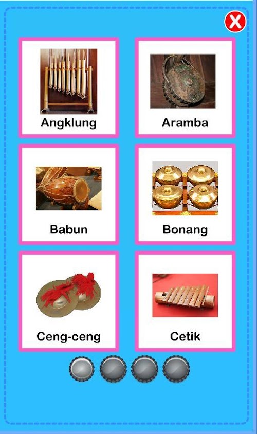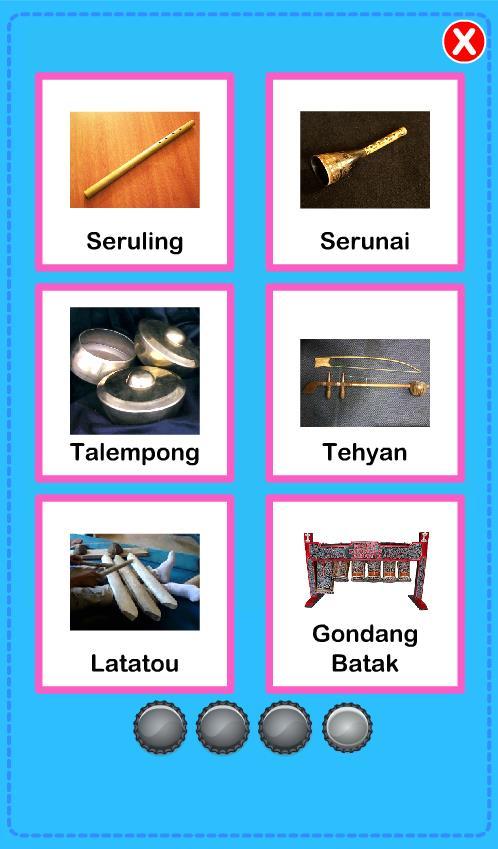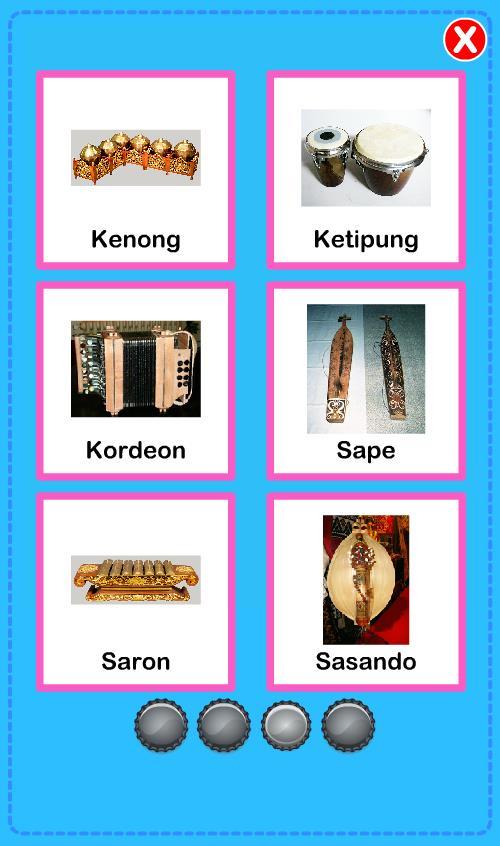Kami terus mengembangkan tema aplikasi dan permainan untuk pembelajaran anak-anak. Introduce your child to the sound of folk music instruments. It is very nice for them to know the original sound. Simply touch the instrument, the sound will appear by itself.