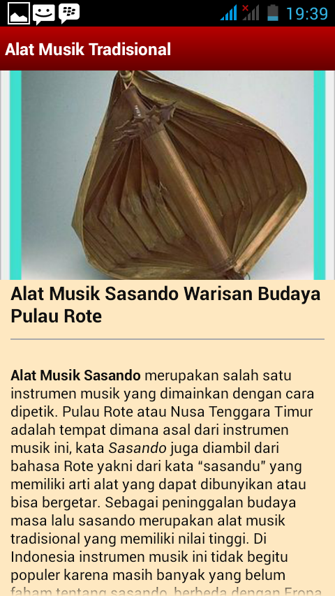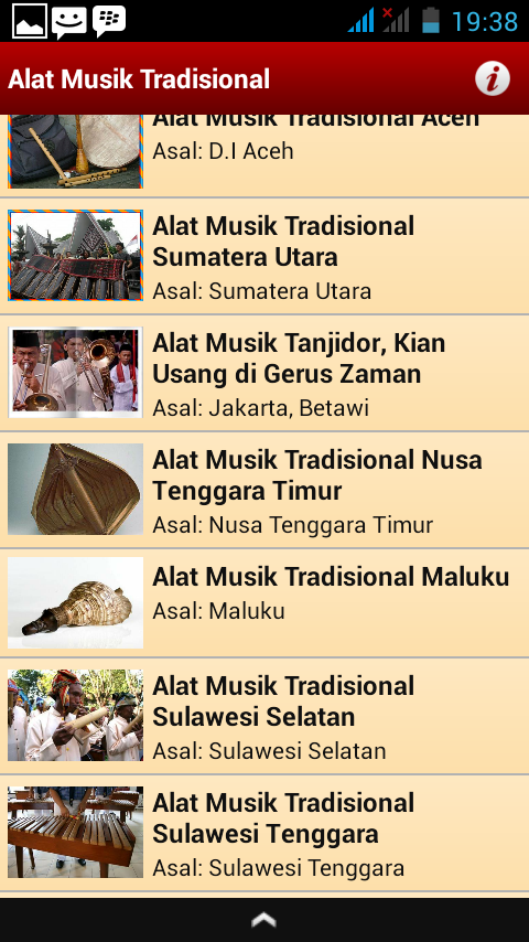 Semoga bermanfaat untuk melestarikan budaya Indonesia terutama mengenai alat musik tradisional Indonesia.Traditional Musical Instruments is an application that can run offline (no Internet connection) to enable users android smartphone to know better about the musical instruments that exist in Indonesia and overseas.
