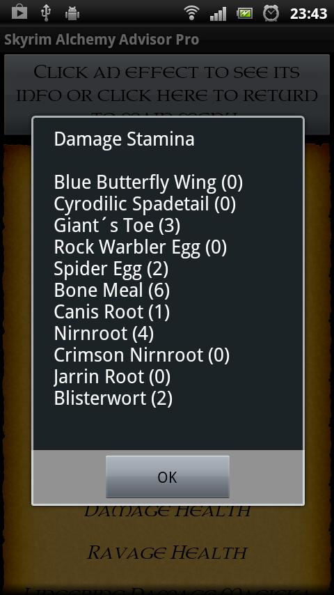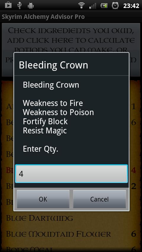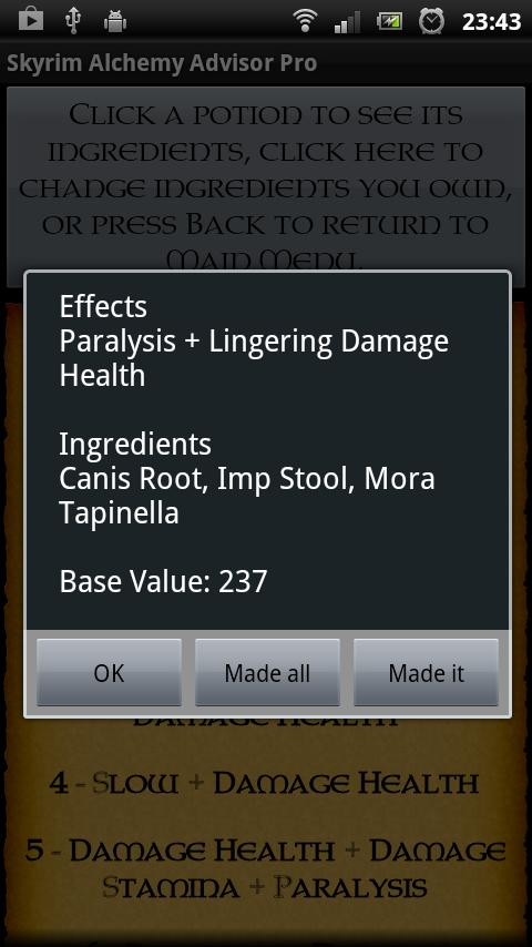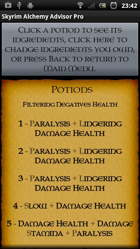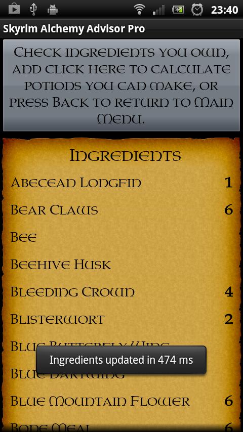 It is really easy to use. You can check ingredients you own, or increase and decrease quantity by pressing volume buttons. Long click on an ingredients, will show its effects and let you edit quantity. When you are ready, pressing a button all the potions you can make are calculated, using 2 and 3 ingredients.
