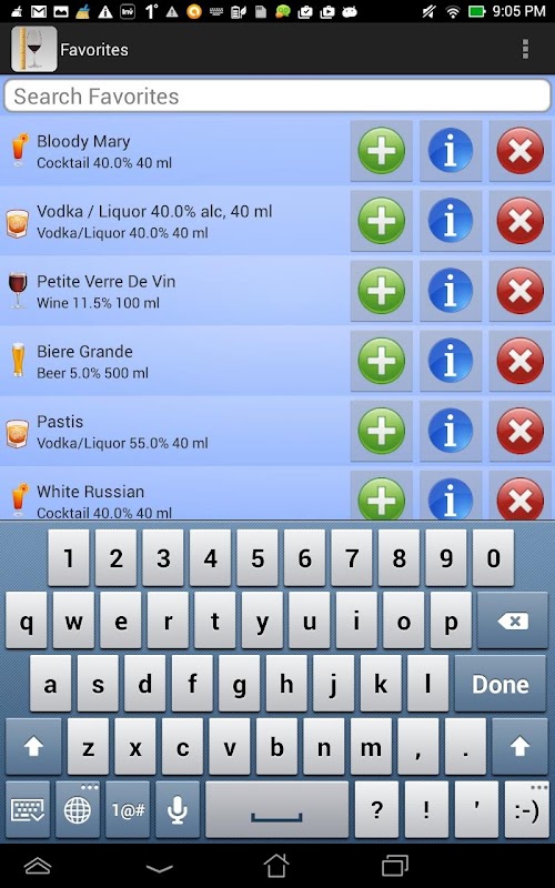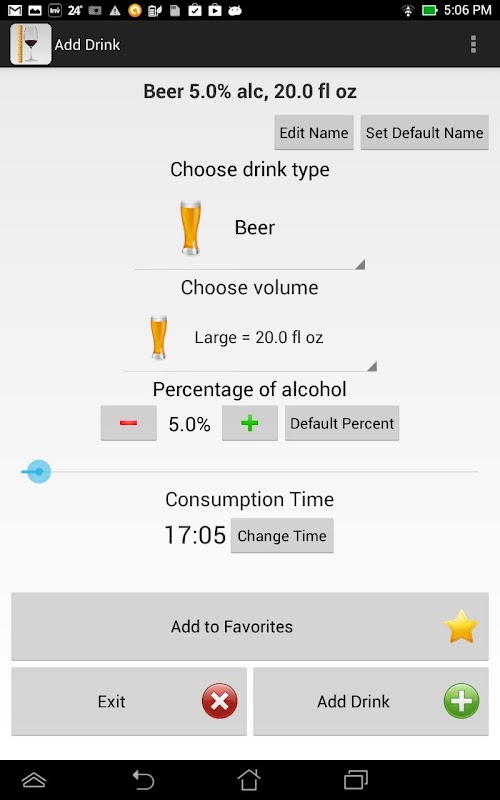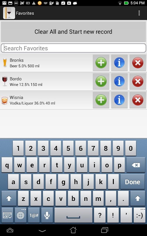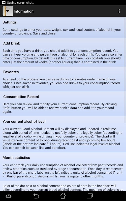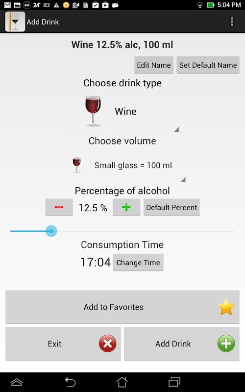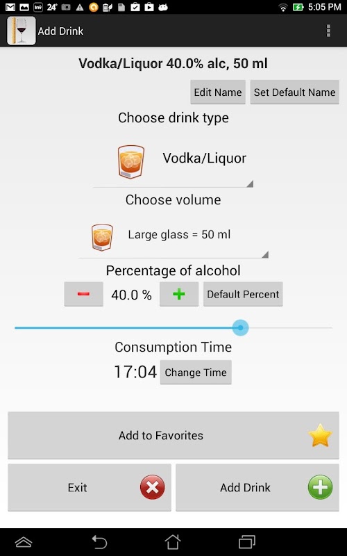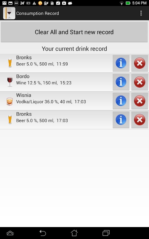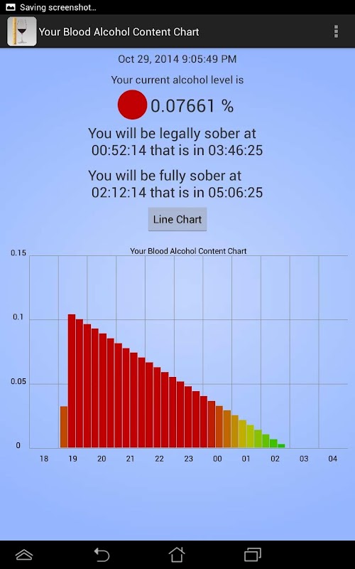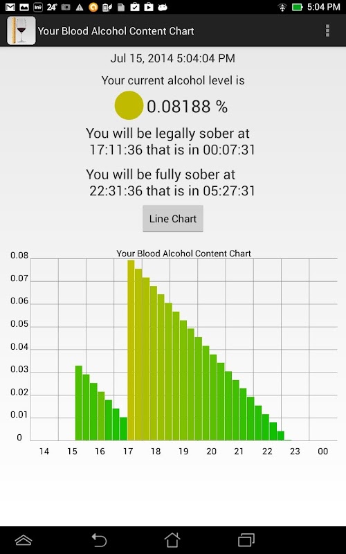 AlcoTest Blood Alcohol Content calculator will let you find out current alcohol level in your blood. It keeps track of all alcoholic drinks you take. Your current Blood Alcohol Content will by displayed and updated in real time, along with period of time needed to get fully sober and legally sober (according to legal level of alcohol while driving in your country or province). The chart will visualize your content of alcohol during recent past and upcoming few hours. You can switch between line and bar chart. To speed up the process you can save drinks to favorites under name of your choice. Once saved in favorites, you can add drinks to your consumption record with just one click.