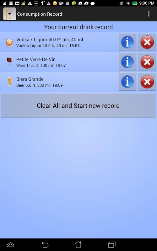 Your can track your daily consumption of alcohol, collected from past records and review statistics such as total and average consumption.