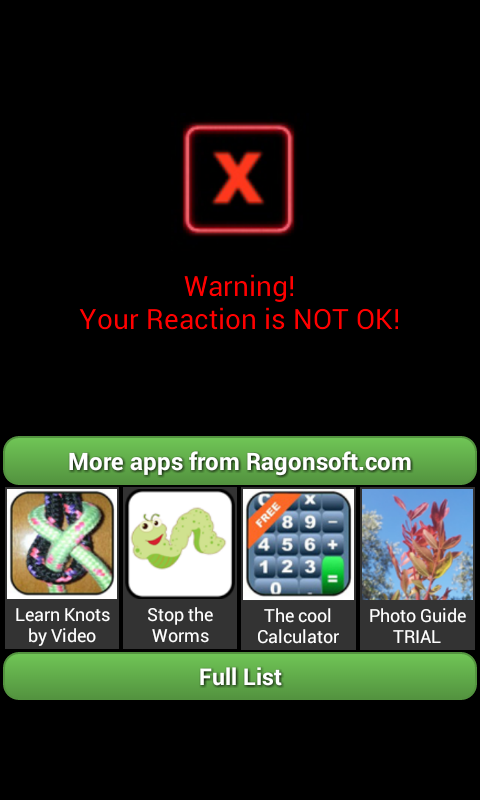 How strong are you drunk? Great test! Test your reaction Protect yourself before writing a text message or even drinking and driving. Always test before Press as fast as they can for the green light! (Application in English) Akohol, fatigue, medication can shorten their reaction time massively. And worse, the co-ordination. The app assesses your state, based on a test. (No blood alcohol calculator!)! Typical errors under alcohol: - Too slow - Wrong box - Does not hold true Use at your own risk. No liability or warranty. Not to be used for road traffic.