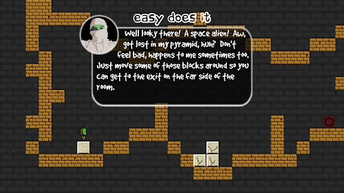 In this puzzle-platformer, you play Alex, a little alien who crash-lands on Earth, and in the process becomes trapped in the mummy's pyramid! Now, you must escape each room in the pyramid by stacking giant limestone blocks, dangling from perilous platforms, and soaring from springy springs to make it to the exit!