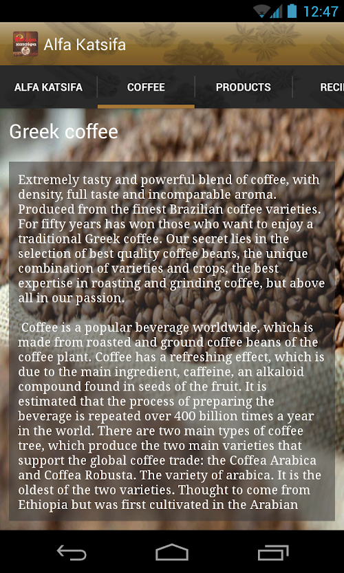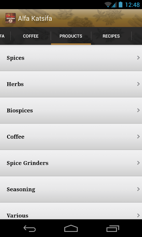 Alfa Katsifa App is all about taste in our life.It presents a big variety of spices and herbs in all possible packagings. Shows clever and creative ideas , how to use herbs and spices , in everyday recipes. There is also a tribute in greek coffee and recipes of making a greek coffee.