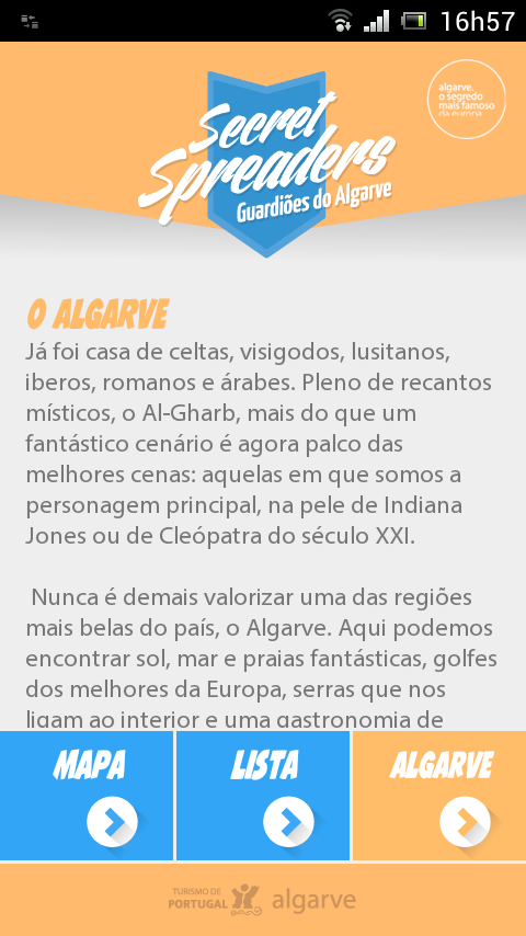 É isto que lhe pedimos: que valorize o Algarve, que é de todos nós. E enquanto o faz, que se divirta. A ideia desta aplicação é que se envolva e ao mesmo tempo se descubra: vamos revelar-lhe os segredos mais escondidos desta bela região. Pedimos-lhe que seja um(a) guardião(ã) destes segredos. Mas não os guarde só para si. Os melhores segredos são aqueles que são tão bons, que precisamos mesmo de os partilhar com alguém.Pure air, sea, out of sight, rolling green mountains. Fresh fish, seafood and recipes to make your mouth water ... Does paradise? If this place existed and had well drawn on your map, would be able to keep a secret?
