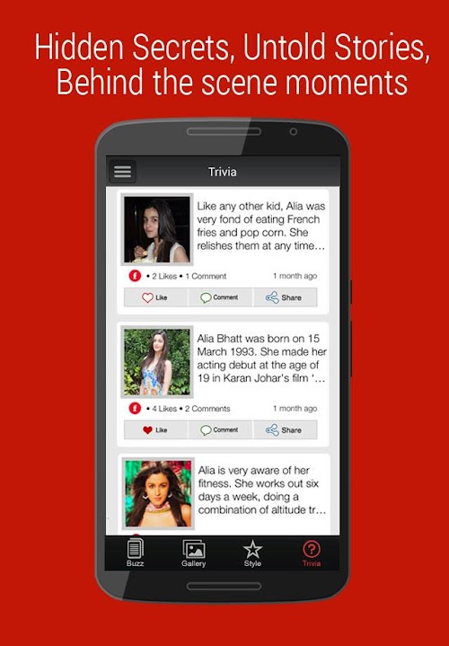 Just download the app and get access to Alia Bhatt’s gallery where you will get to know about Alia Bhatt’s dazzling style and interesting trivia. You will never be away from Alia’s latest bollywood updates as you will get gossips, trivia, videos, and her hot images wherever you are! You will get the freedom to share Alia’s stylish images with your friends and like them too.