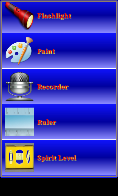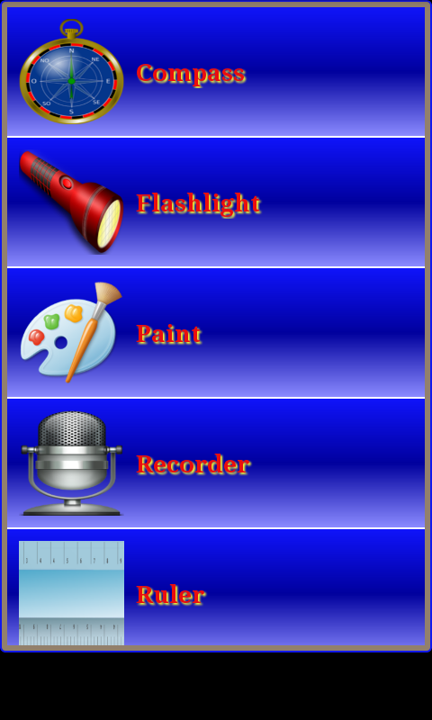All In One ToolBox This is an application that integrates several tools like Compass, Flashlight, Painter, Spirit Level, Ruler and Recorder in one app.