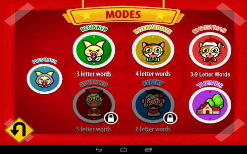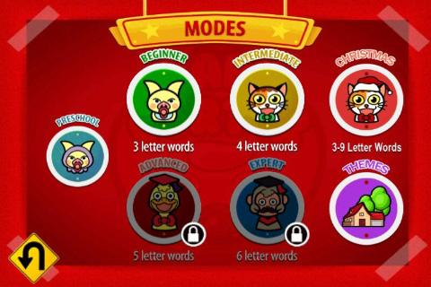 To start, choose which mode you'd like to try: Preschool, Beginner, Intermediate, Advanced, or Expert. As you progress through each mode, you'll play with longer words, starting with three-letter words in Preschool to six-letter words in Expert. Within each mode there are nine stages, many of which you'll have to unlock. So let's get going!