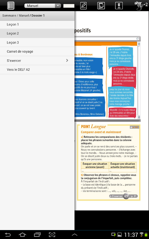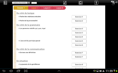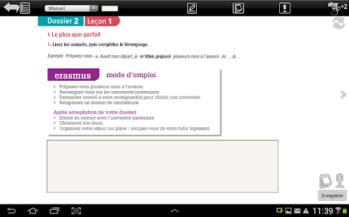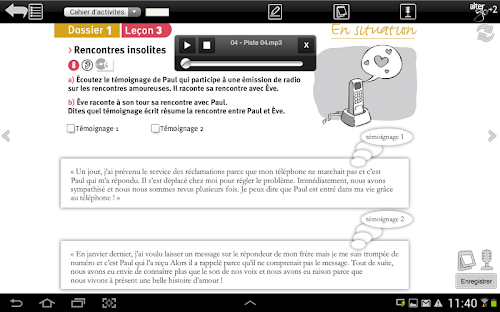 Take and save course notes, complete exercises, add comments and record your progress in oral French. All exercise activities (S’Exercer in the student’s manual and the entire student’s workbook) are developed specifically for interactive touch screen and stay in the app’s memory from one session to the next.