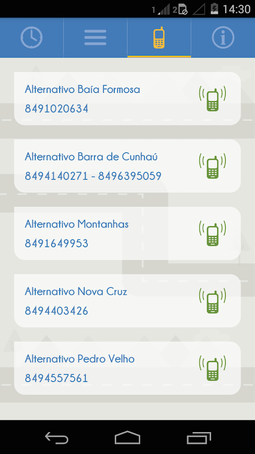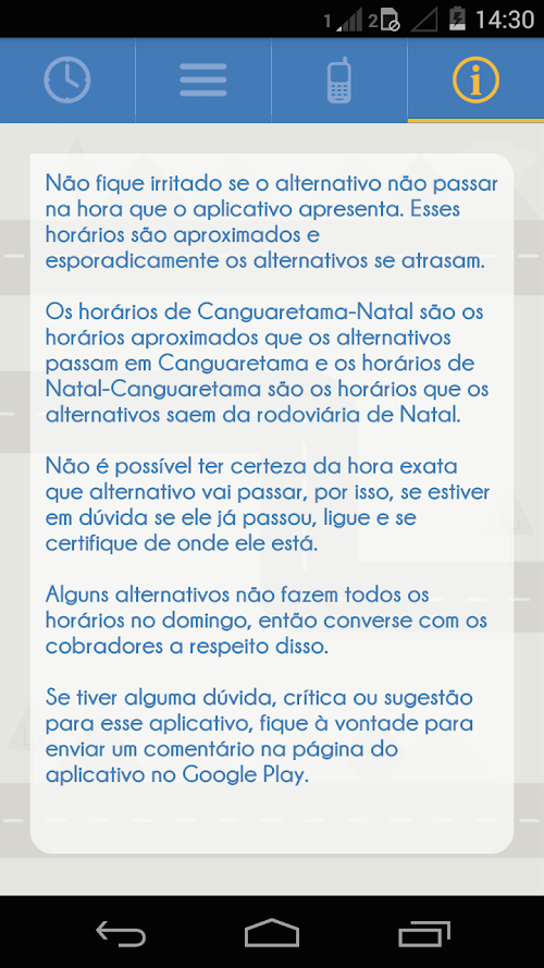 Este aplicativo descreve os horários de funcionamento dos alternativos que passam em Canguaretama. Ele mostra os próximos alternativos tanto no sentido Natal-Canguaretama, quanto no sentido Canguaretama-Natal. Além disso possui os telefones dos alternativos para que se possa tirar quaisquer dúvidas.This application describes the operating hours of alternative passing in Canguaretama. It shows the next alternative both towards Christmas-Canguaretama, and in Canguaretama-Natal sense. Also has the phones of alternative so you can take any questions.