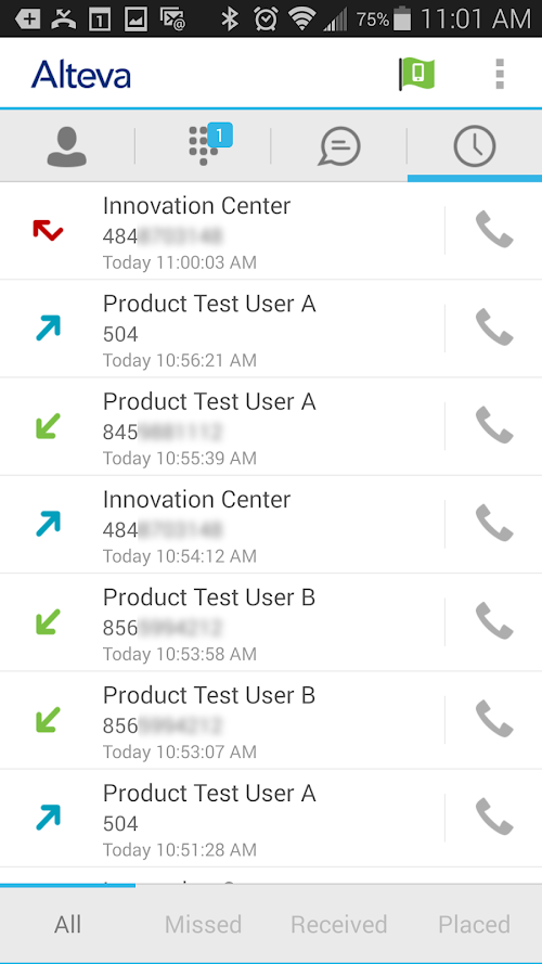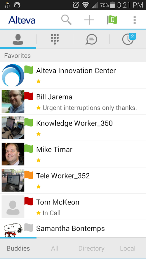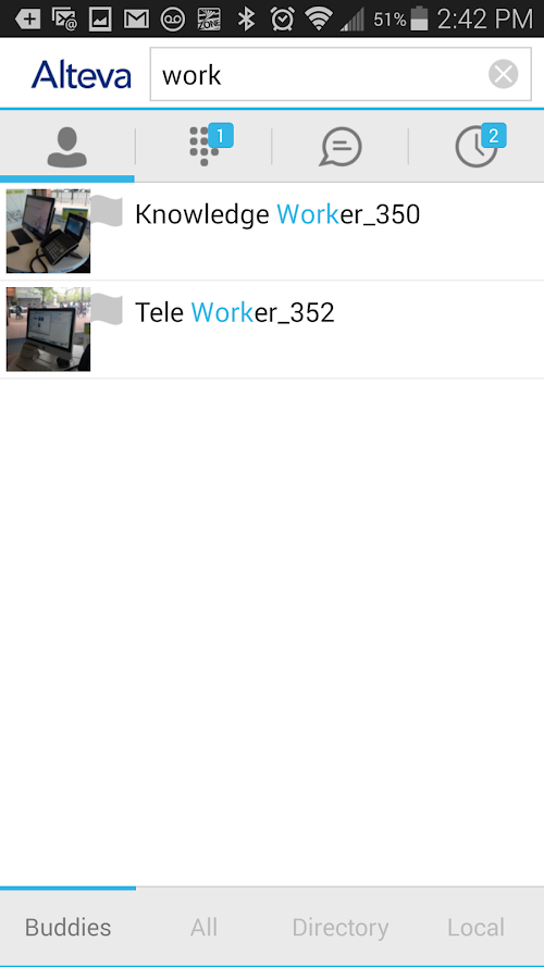 By adding the Alteva Mobility Smartphone client to an Android platform the user can enjoy the most convenient and intuitive interface for multimedia communications. It is integrated with the Alteva platform for various calling features. End-users keep a contact list in the client showing the presence status of their friends, family and colleagues. From this single interface the end-users can easily initiate and receive phone calls, video calls and instant messages. The contact list is perfect for easily starting multimedia communication, encouraging users to smarter and more frequent communication.