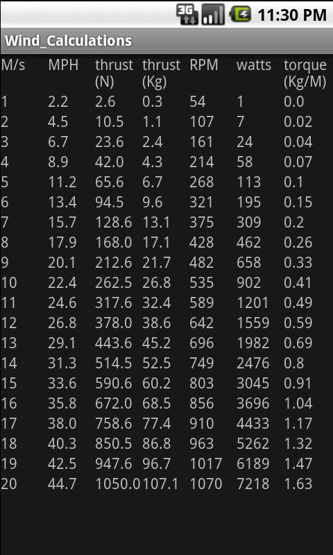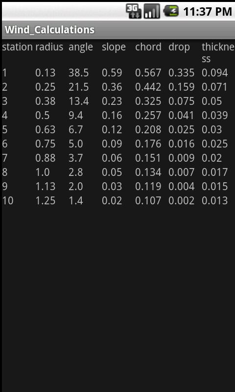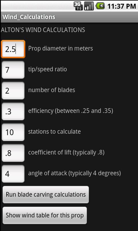 This is basically an Android version of my popular web-based wind calculations page found on the internet. It has the same functionality, but without the legends and explanations. Of course, here we are not trying to teach the subject, but rather provide a convenient portable way to to get blade-carving and performance figures.