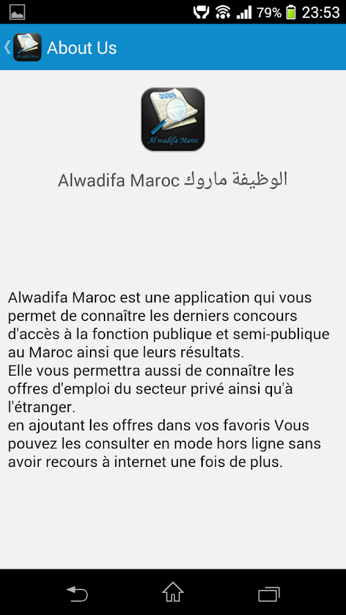 en ajoutant les offres dans vos favoris Vous pouvez les consulter en mode hors ligne sans avoir recours à internet une fois de plus.Alwadifa Morocco is an application that lets you know the last competition for access to the public service and parastatal in Morocco and their results.