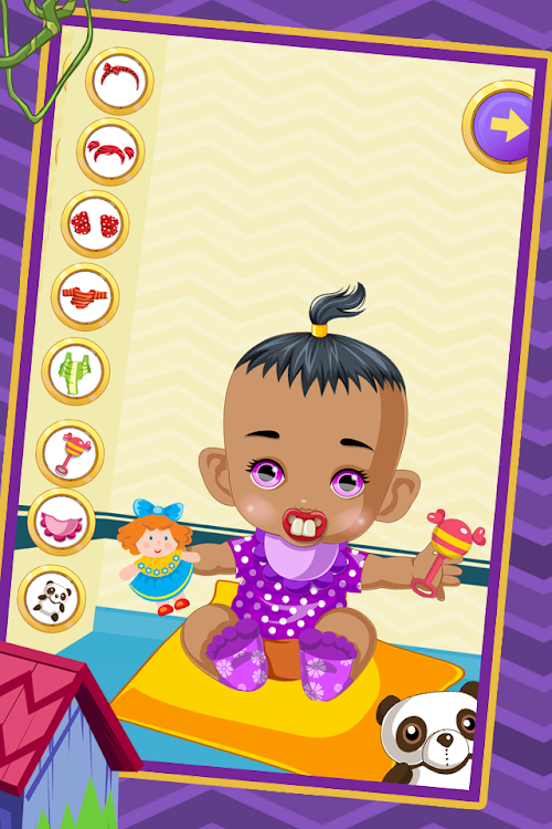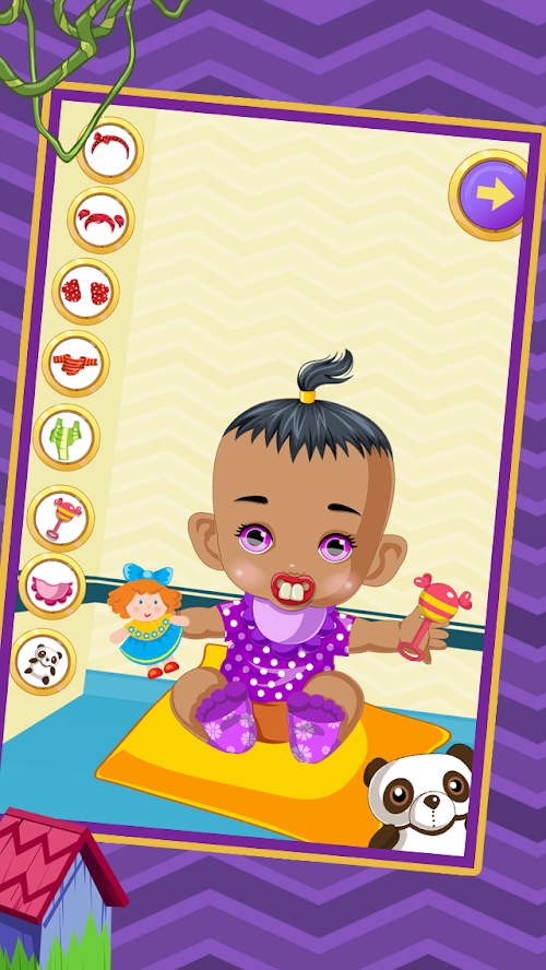 First, it’s time to dressup your baby girl in style. Choose from dozens of hairstyles, outfits, onesies, dresses, jeans, silly pacifiers, accessories and toys! Your fashion plate baby is now hungry and ready to eat.