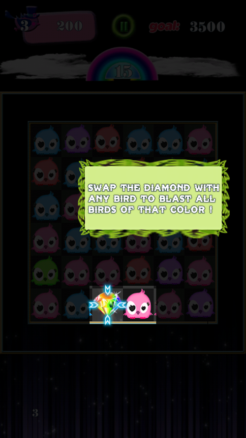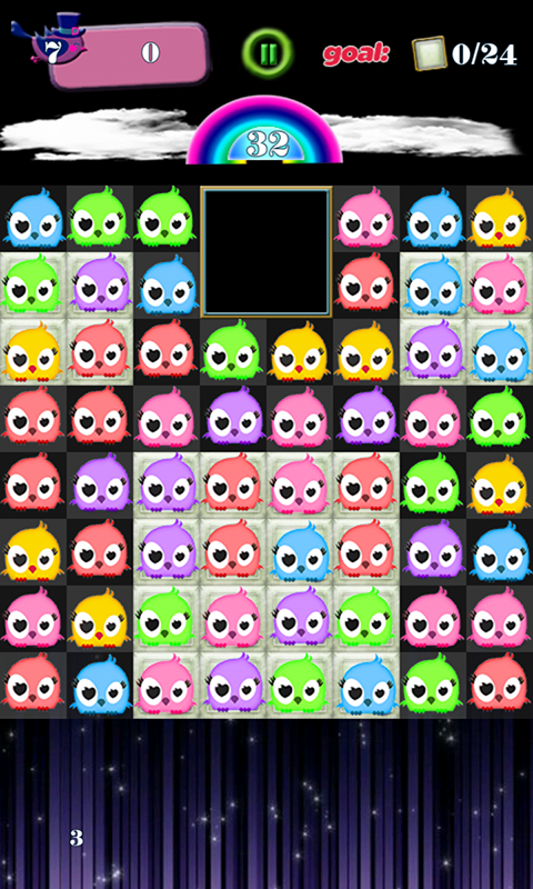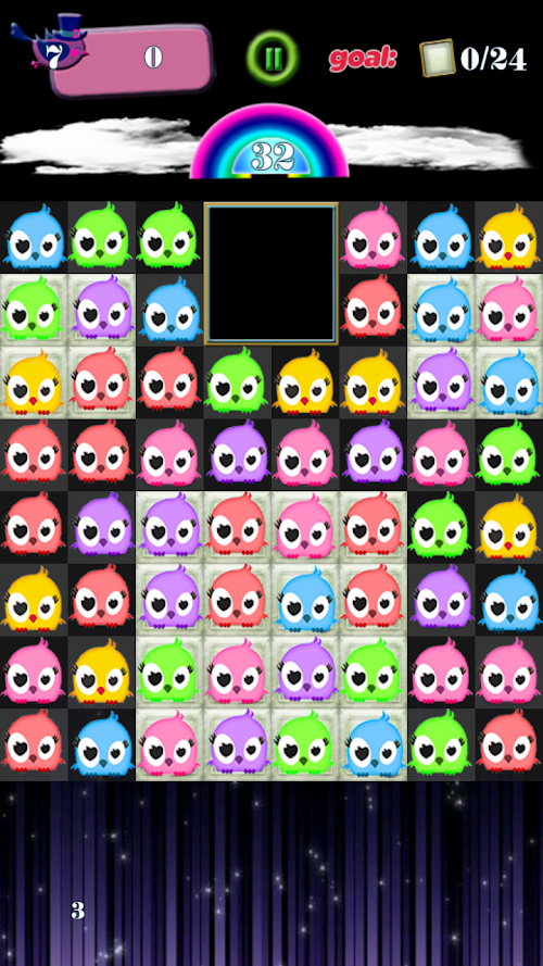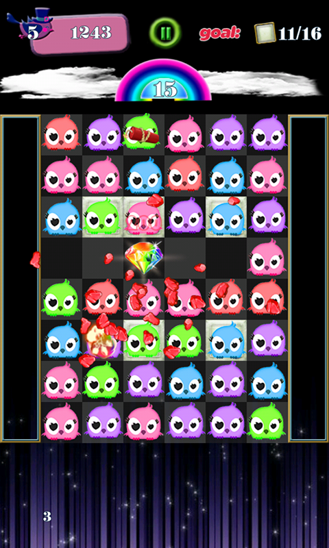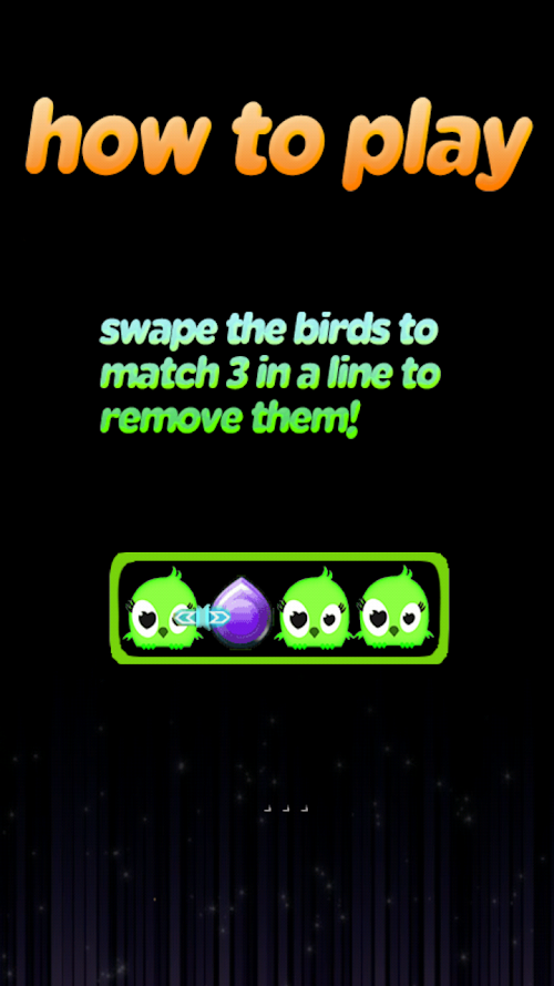 A simple play, above and below the diagonal movement, three or more of the same color of the bird, horizontal / vertical line can be eliminated, to obtain the score.