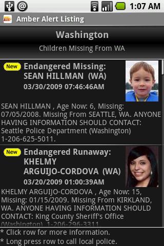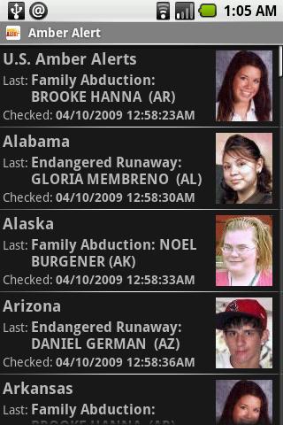 Provides quick access to Amber Alerts by state and for the entire country. Click a row for more information or long press to call the local police.