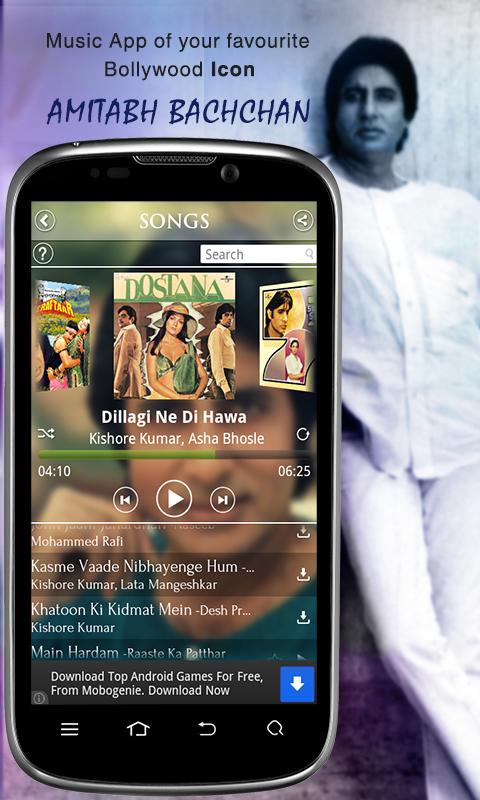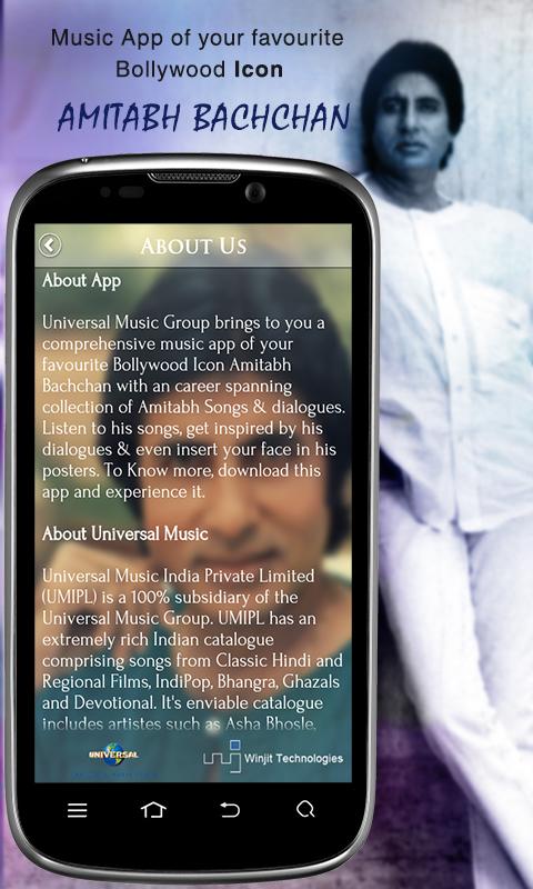 Universal Music Group brings to you a comprehensive music app of your favourite Bollywood Icon "Amitabh Bachchan" with an career spanning collection of Amitabh Songs & dialogues. Listen to his songs, get inspired by his dialogues & even insert your face in his posters. To Know more, download this app and experience it.