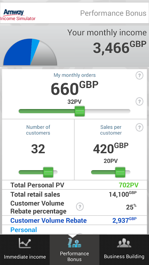 This is an App for Amway Europe, which allows you to estimate examples of potential earnings based on product selling and building a balanced Amway business.