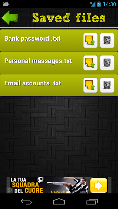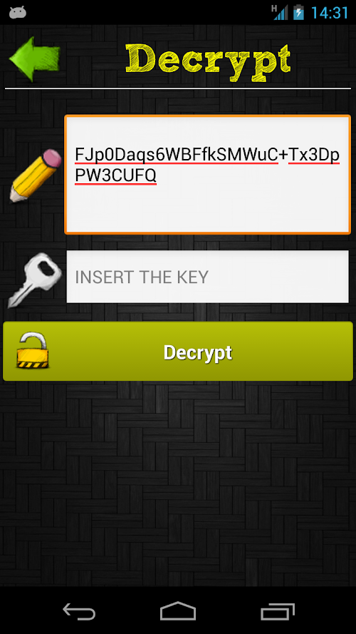 AndCrypter is an application that lets you easily create encrypted text messages using an encryption key. You can then send or save messages into files that you can open whenever you want. Without the key that has originally created the massage is impossible to decypher it, so noone can watch your saved files or understand your secret conversations.