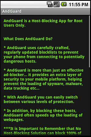 AndGuard prevents your phone from connecting to potentially dangerous hosts (Ads, Spyware, etc.)