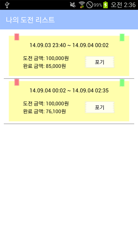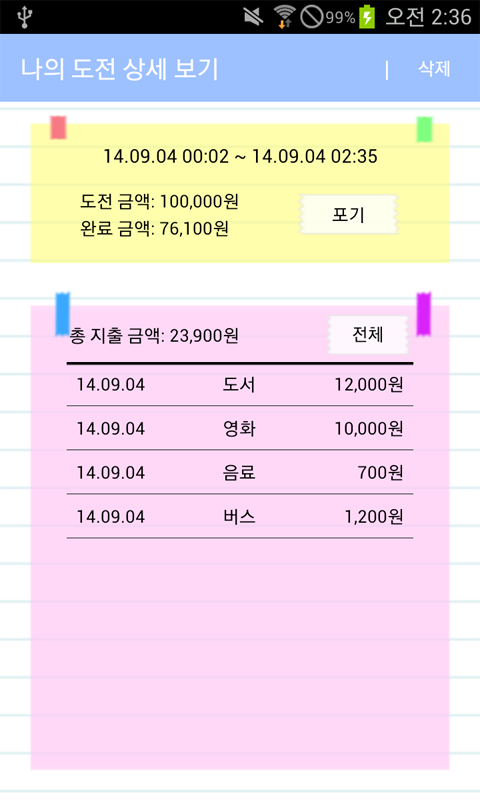 2. 도전 리스트 보기 - 지금까지의 도전 기록을 보여줍니다. 도전 시간, 도전 금액, 지출 내역을 확인 할 수 있습니다.