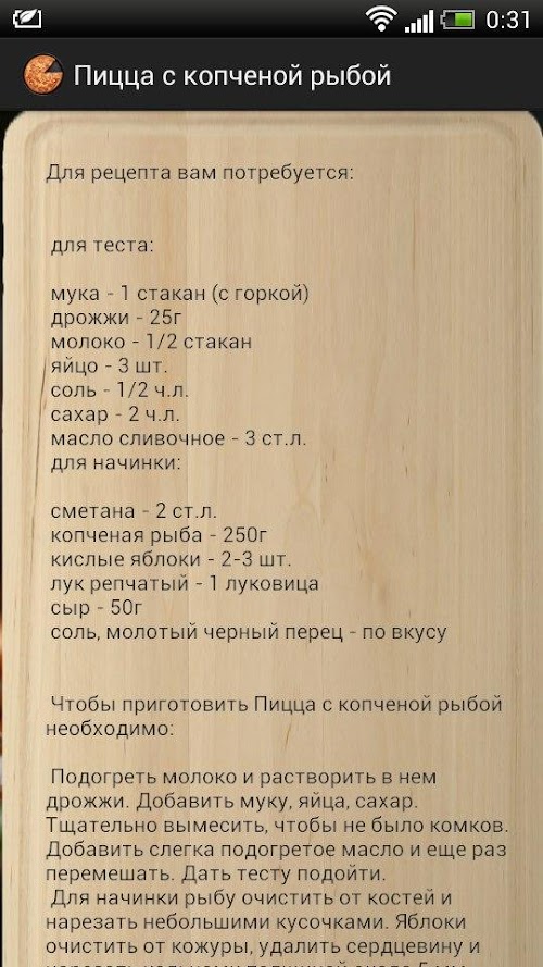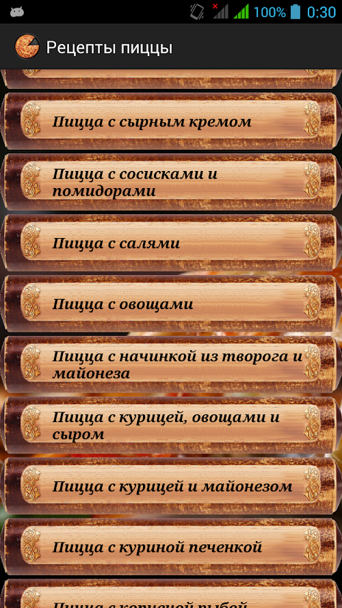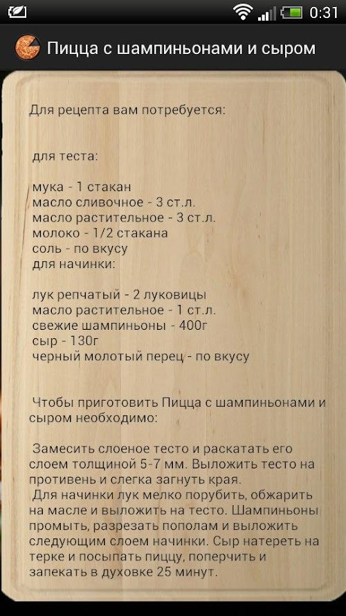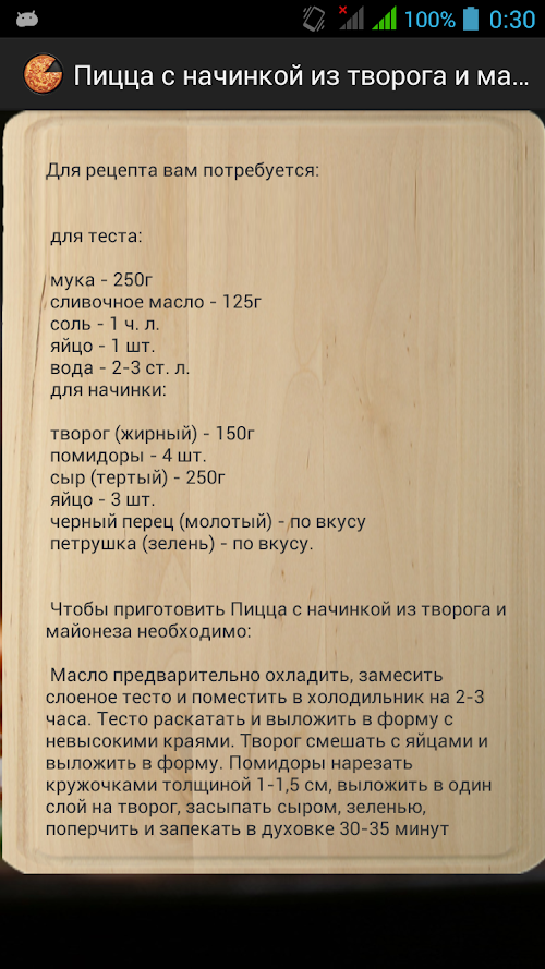 Приложение не требует доступа в интернет, все рецепты доступны в оффлайн режиме.Pizza - flan as lozenges, coated fillings, primarily molten cheese. One of the most popular dishes in the world, the Italian national dish. In order to prepare delicious pizza you need a good recipe for pizza dough and filling recipe for pizza.