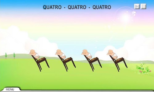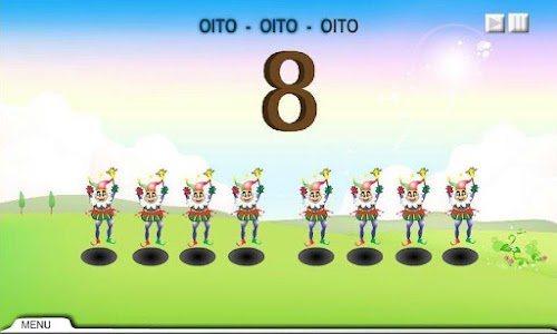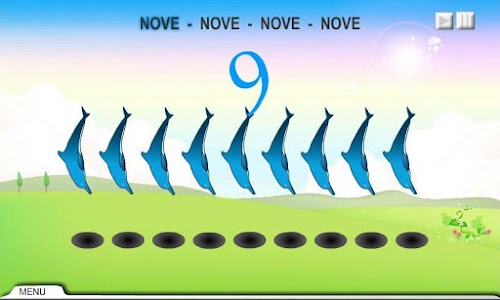 Figuras de um golfinho, de um cãozinho (au-au) e de um bobo da corte são mostradas em todos os números para a criança entender a diferença da quantidade de cada número.Cartoon shows the numbers sung with their quantities.