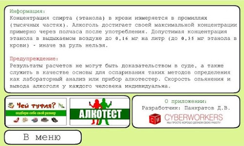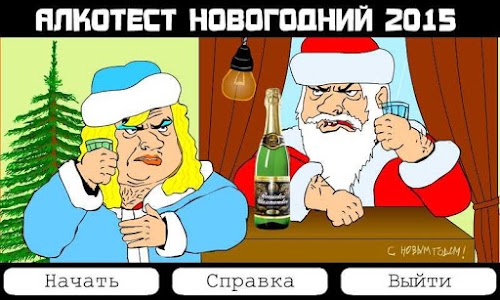 Приложение "Алкотест Новогодний", с веселым Дедом Морозом и Снегурочкой, не только порадует веселую компанию и вас, но и поможет определить уровень алкоголя в вашей крови, подскажет время его полного выведения, если, например завтра, вы планируете куда то ехать.