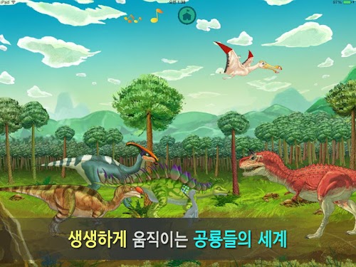 동화속의 공룡들이 입을 벌리고 뛰어다니고 걸어다닙니다. 공룡들을 건드릴때마다 공룡들이 각기 움직이고 입을 '쫙쫙'벌려요!