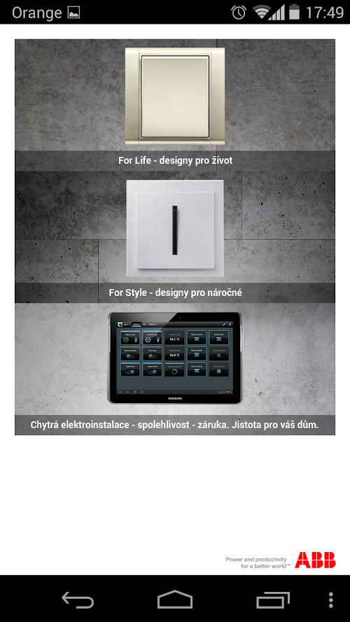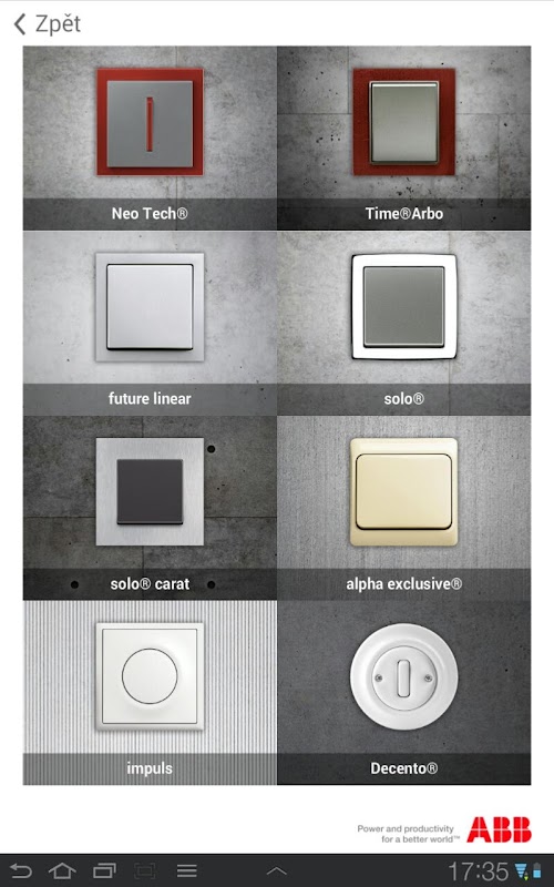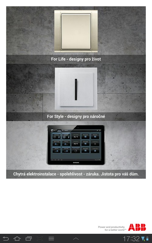 4, you can resize the chosen switch according to your needs. App World switches is designed for easy selection of designer series switches offered by ABB sro, Elektro-Praga on the Czech market. The application is divided into three parts: For Life - Designs for Life, For Style - designs for sophisticated and clever wiring in filing systems Ego-n ® and ABB i - bus ® KNX. Wherever you are, you can choose products according to your taste and style that fits into your interior.