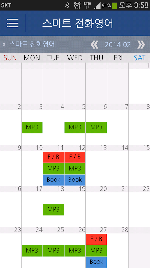 전화영어 수업의 일정관리, 수업내용 다시듣기, 녹음파일 다운로드, 교재보기 등의 학습서비스를 제공합니다.