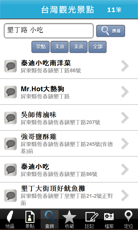 searching all columns by keyword and browsing through Taiwan counties and districts.