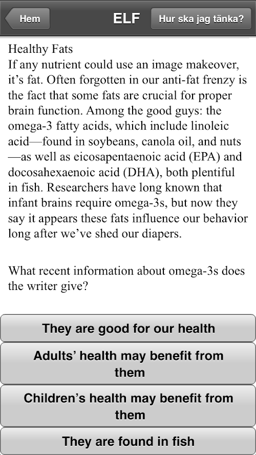 The understanding and techniques you learn here, you can then use to solve similar tasks quickly and effectively when you write Högskoleprovet "for real". This is the quantitative (mathematical) categories ENOUGH, XYZ and KVA, where both the mathematical theory and the methods needed to solve the problem are reviewed. This also applies to the verbal (linguistic) categories WORD, MEK (sentence completion) and ELF (English reading comprehension) where words, meningars and texters importance and structure explained.