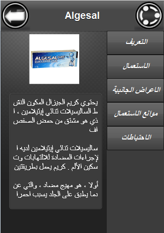 2) توفير شرح عن الدواء بأربعة أقسام مختلفة معلومات العامة, شرح تفصيلي, تحذيرات خاصة والتاثيرات الجانبية Encyclopedia of medicines contain detailed and wide for available drugs in the medical field information, it is divided into four sections: general information, detailed explanation, special warnings and side effects. To search for the drug in the directory: Try / d Find the medication name in the search engine drugs