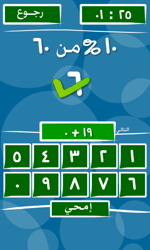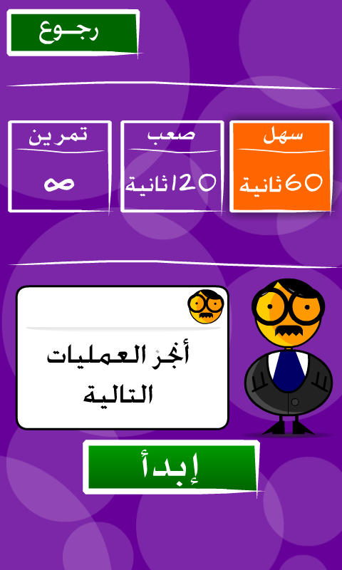 المستوى الصعب : في البداية يجب الحصول على علامة 15/20 لفتح هذا المستوى حيث يطلب من الاطفال الاجابة على اسئلة الحساب الذهني ( الجمع الطرح الضرب و القسمة الاس و النسبة ) و هذا خلال مدة 120 ثانية