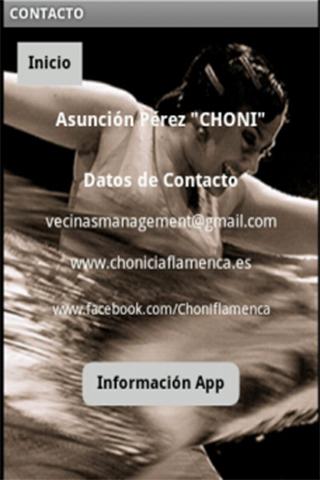 App oficial de Choni Cía Flamenca. Una aplicación para estar al día de las últimas noticias, eventos, agenda de espectáculos de la bailaora y coreógrafa sevillana Asunción Pérez "Choni" y su Compañía Flamenca. Aplicación diseñada y realizada por Gestión de Recursos Digitales S.L.Choni official App Co. Flamenca. An application to keep up with the latest news, events, calendar of events for the dancer and choreographer from Seville Asunción Pérez "Choni" and Flamenco Company. Application designed and built by Digital Asset Management Ltd.