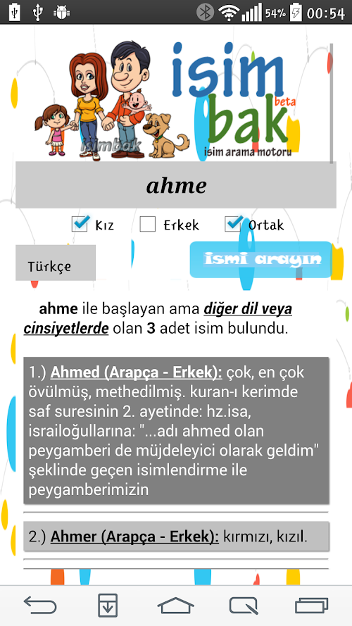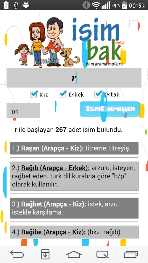 Ara kısmına hiç bir şey yazmadan istediğiniz bir dili seçerseniz o dildeki tüm isimleri listeyebilirsiniz.İsimleri daha kolay bulabilmeniz için daha bir çok özelliği de uygulamamızda bulabilirsiniz.