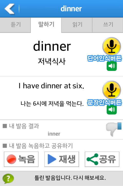 스마트폰의 TTS기능을 이용하여 영어를 듣고, Voice Search기능을 활용하여 내 발음을 검증받을 수 있습니다.
