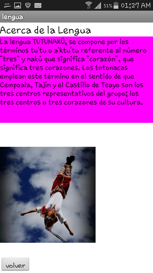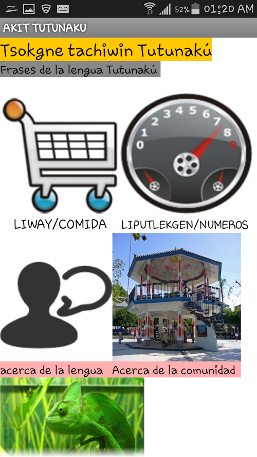 el uso de las tecnologias para la revitalizacion de la Lengua Tutunakú, habré nuevas posibilidades para fortalecer y aprender la lengua en la region. es una herramienta que es de mucha utilidad y representara un alto potencial para los maestros y alumnos del grupo indigena Tutunakuthe use of technologies for the revitalization of Tutunakú Language, will have new opportunities to strengthen and learn the language in the region. It is a tool that is very useful and represent a high potential for teachers and students of the indigenous group Tutunaku