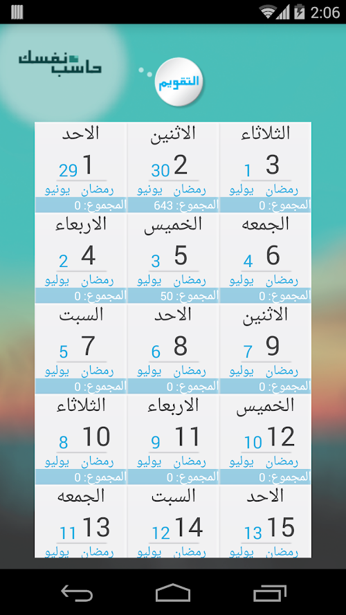 ايضا يمكنك من خلال اختيار التقويم عرض التقرير عن اي يوم مضى لمراجعة نفسك و اعمالك في هذا اليوم
