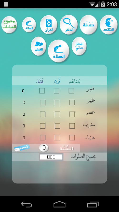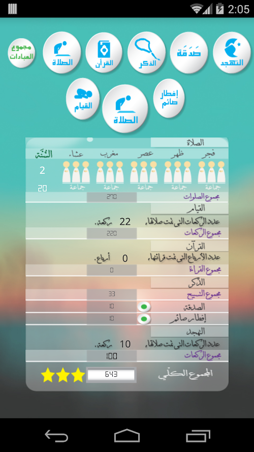 يطلب منك التطبيق تسجيل كل الفروض و الواجبات و الاعمال الصالحة التي قمت بها خلال اليوم و في نهاية اليوم يظهر لك تقرير بالاعمال التي قمت بها مع اعطاء درجة لكل عمل و احتساب النتيجة النهائية لليوم